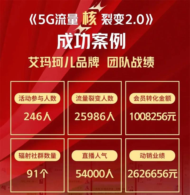 01艾玛珂儿与微赢共创第一次合作选择5G流量核裂变2.0,通过定制策划+精细化社群运营+落地执行,帮助品牌突破引流裂变难题,很好地帮助品牌纳新流量、裂变流量、激活客户,从而创造出理想的业绩。