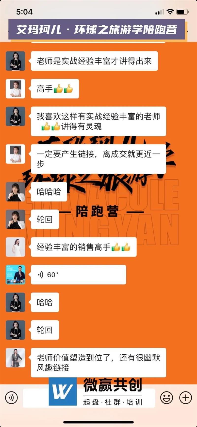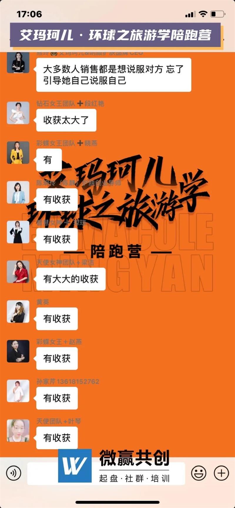 在活动展开过程中,微赢共创的专业导师团队为代理赋能,在社群内进行高效课程输出,不断鼓励代理、激发代理活性,让每一位艾玛珂儿的家人能够通过这次旅游有一次新的体验,面对生活压力也能展现自己最勇敢的一面。在这次旅游的过程中,赋能导师全程陪跑,进一步帮助代理解决销售问题,传授专业的销售话术,帮助代理成交客户。同时创始人带领整个团队,给予代理信任。