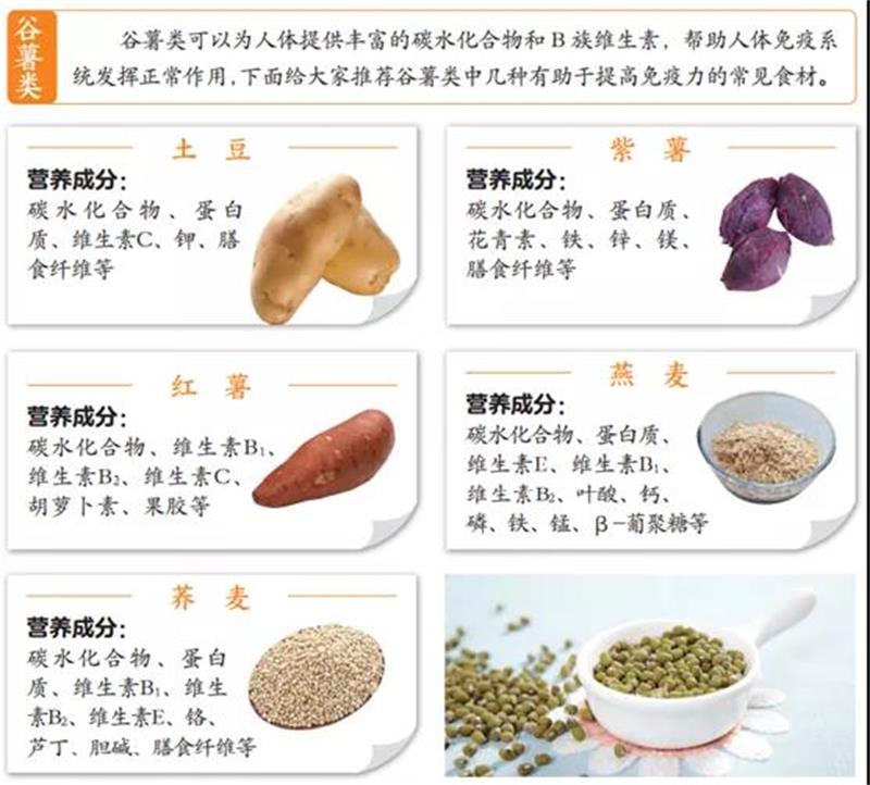 我们平时生活中常见的食材大致可分为谷薯类、蔬果类、菌豆类、畜肉类、禽蛋奶类、水产类等,每一类食材对提高人体免疫力都有不可替代的作用。