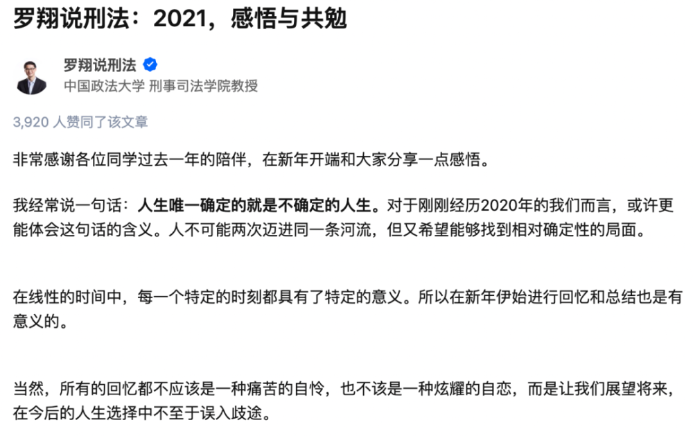 2021年新年,罗翔发布了一篇诚挚的新年“感悟与共勉”,提到了自己2020年的意外成名,“这就像中彩票,应该只是运气而不是成就。”