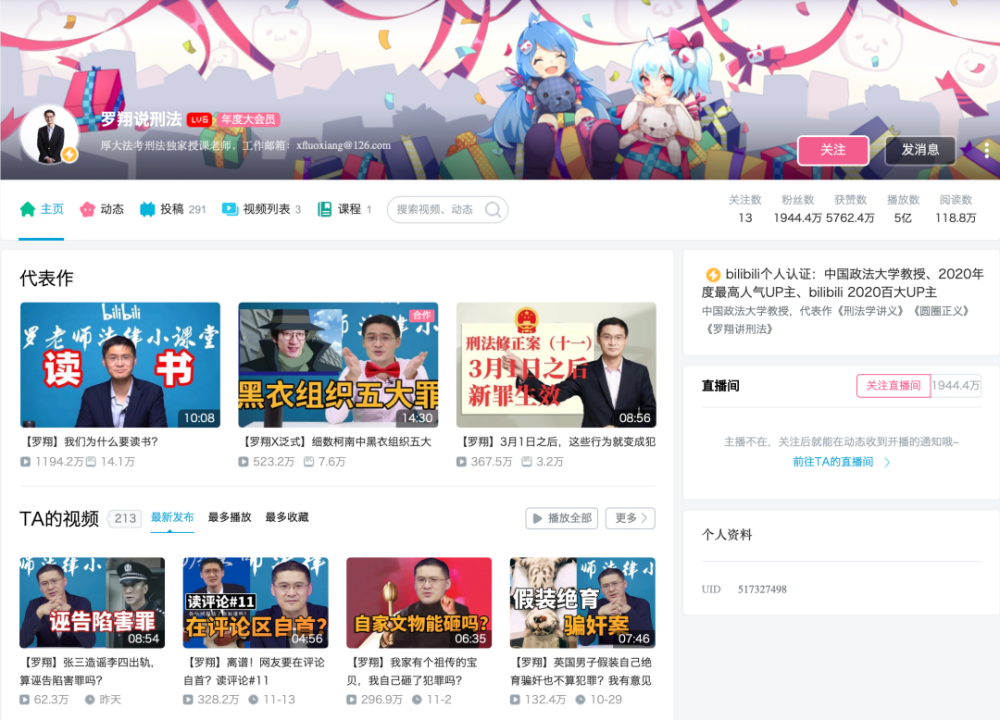 回到罗翔本人。作为B站粉丝数最多的个人UP主,视频播放量最高达4.9亿次,获赞5700万,他得到的喜爱和支持,如能变现,当然不止37万。