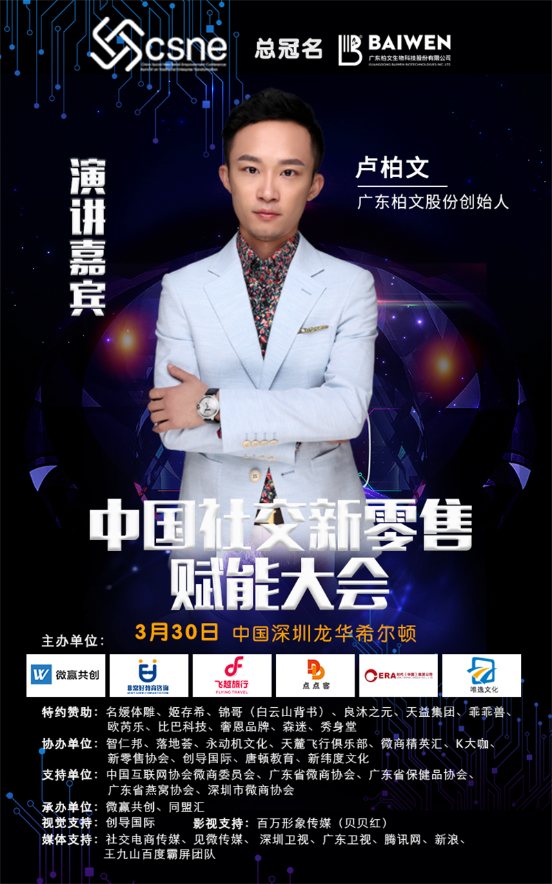社交新零售转型之路势在必行,助力传统企业转型变革,2019社交新零售将开启一个新纪元。我们强强联手,一起赋能传统企业渠道变革;我们携手并进,一起助力企业创新转型升级;行业最顶级的思想盛宴,我们一起共同发声,我们最专业+最落地+最不同+最健康。此次大会总冠名广东柏文股份和支持单位中国互联网协会微商委员会、广东省微商协会、广东省保健品协会、广东省燕窝协会、深圳市微商协会及协办单位智仁邦、落地荟、永动机文化、天麓飞行俱乐部、微商精英汇、K大咖、新零售协会、创导国际、唐顿教育邀请您一同见证传统企业渠道变革,见证最实战的起盘解决方案,最落地的培训解决方案。