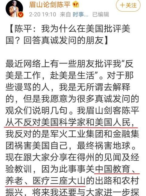 看看人家的回应,表明自己虽然人在美国,但是根本不是图美国的大房子高福利,而是为了更高的理想和目的:那就是事关中国教育、养老、医疗三座大山和乡村振兴。真是人在美国,心系中国啊。以前在网络上看到过一个帖子:移民就意味着不爱国吗。作者觉得虽然自己移民了,但是被别人说不爱国感到很委屈,觉得自己依然有“中国心”。陈平之流和这个作者其实都是一路货色,说难听点叫做“又做又立”,爱国的前提是你至少是这个国家的人,连前提都不存在了还谈什么“爱国”,当然爱的是哪个国已经不言而喻了。