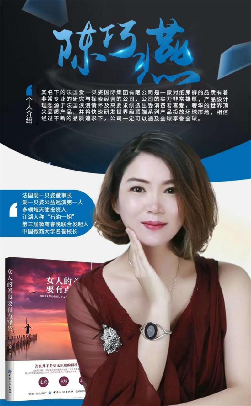 爱一贝姿创始人陈巧燕正是诸多成功女性的杰出代表,她用超前的眼光和胆略果断抓住了这次时代赋予的千载难逢的机会。陈总用她自己特有商业智慧,克服了从传统行业转型新商业的诸多风险和各种“水土不服”。迅速成为行业翘楚,受到大会的一致赞赏 。