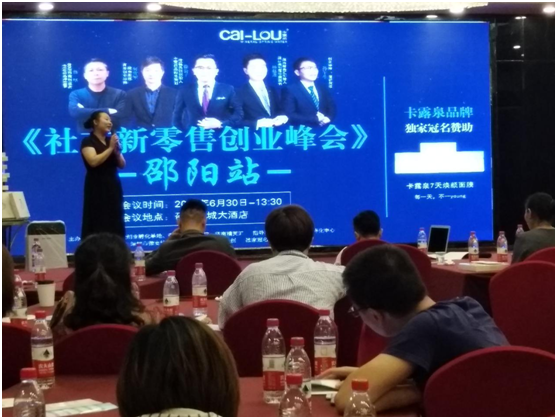 2018年6月30日,由邵阳一起创业孵化基地、微赢共创商学院、微商精英汇主办,深圳市微商协会、乐琪美国际、微赢共创协办,中科青年创业孵化基地中心指导,卡露泉品牌独家冠名的《社交新零售创业峰会》在邵阳召开并取得圆满成功。出席此次会议的有微赢共创创始人、卡露泉品牌总策划徐公子,微赢共创商学院院长、微商精英汇创始人杨赵进老师,青年创业导师、微商教练何宜军,创业导师、演说教练孙午生,80后微商创业者、卡露泉品牌董事蔡坚及社交新零售创业者、卡露泉品牌合伙人和微商品牌团队长等人。