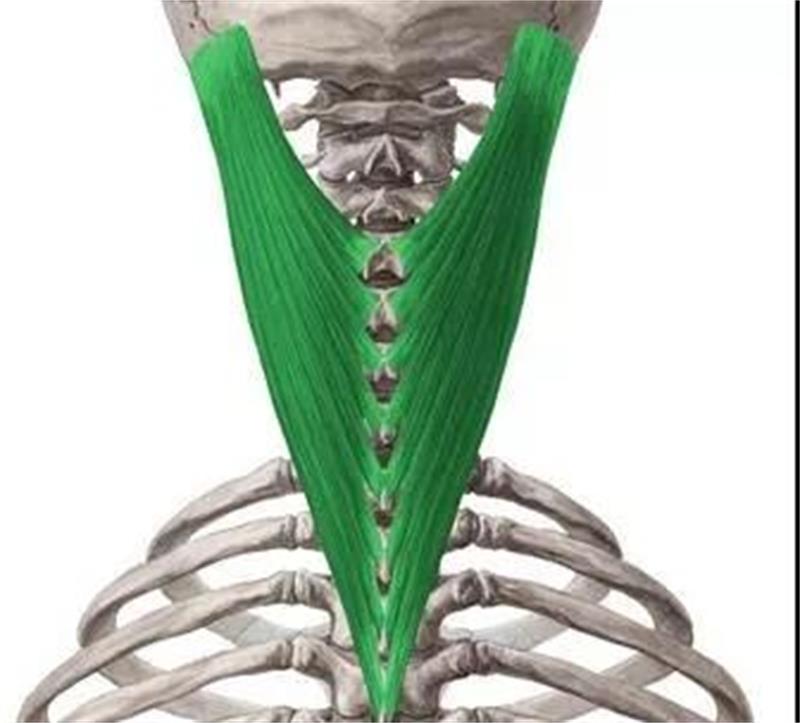 半棘肌包括头半棘肌和颈半棘肌,下方附着于5-6个椎骨的横突,这两条肌肉在颈部背面呈垂直走向,上方附着于棘突或枕骨(头半棘肌),构成颈部浑圆的外形。