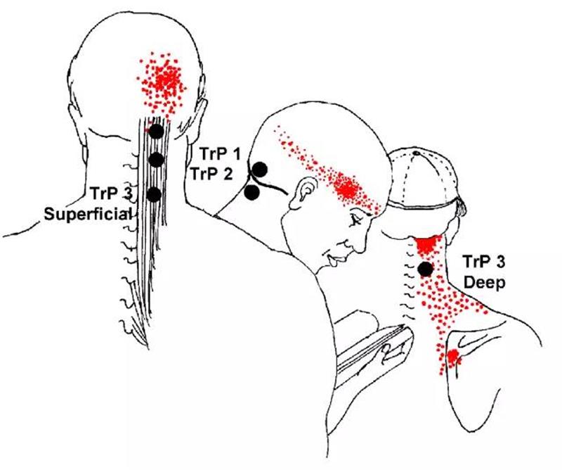 当颈半棘肌内的激痛点会在颅骨底部和颈部之间产生疼痛和酸痛。