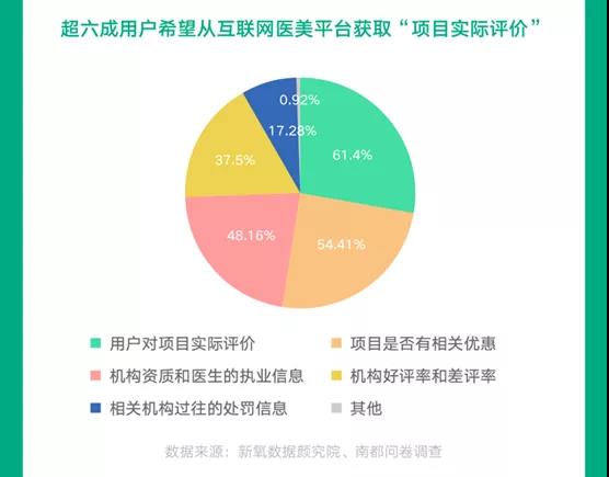 爱美人士了解医美资讯的方式较为多元,医美互联网平台是爱美人士获取信息的主要渠道。白皮书显示,有15.26%用户通过医美互联网平台获取资讯。针对互联网医美平台上对轻医美的信息展示,61.4%的受调研对象认为,“用户对项目的实际评价”是最希望从互联网医美平台上获得的信息。54.41%的人最关注“项目优惠信息”。
