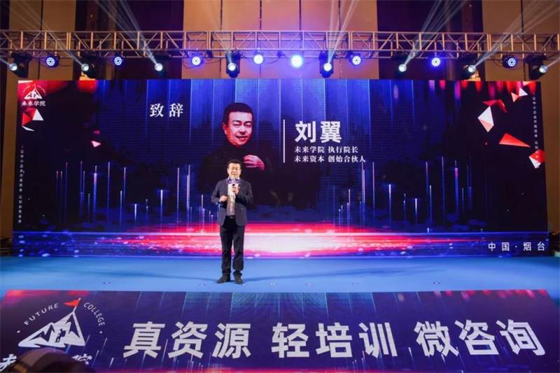 未来学院刘翼院长慷慨致辞,他表示未来学院的现在和将来一定是前所未有的,未来学院强大的社会资源、媒体资源、创投资源、企培资源一定会为会员提供良好的平台服务。