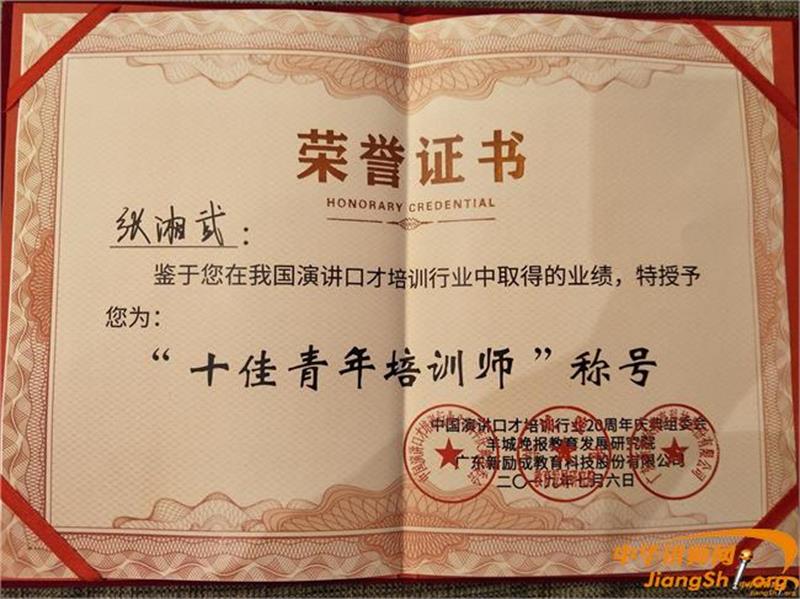 2019年7月6日,由羊城晚报和新励成公司联合主办的“致敬时代 讲力未来”中国演讲口才培训行业20周年庆典在北京梅地亚中心成功举行,来自全国各地演讲协会负责人、演讲口才培训机构负责人及培训师、新闻媒体记者共300人参加。出席本次庆典的领导嘉宾有:原国家体委副主任刘吉、著名演讲教育家彭清一、外交部前新闻发言人沈国放、教育部前新闻发言人王旭明、全国演讲口才培训师考评委员会主任颜永平、广东新励成教育科技股份有限公司董事长赵璧、中国社会科学院研究生院原院长黄晓勇、羊城晚报报业集团管委会委员胡泉、和君集团和航投资市场总监李娟等。东莞市演讲学会副会长、德者口才总经理兼首席讲师张湘武应邀参加会议并荣获“十佳青年培训师”称号。同时在会议现场抢到一个即兴演讲机会,回答彭清一教授提出的社会主义核心价值观24字内容。