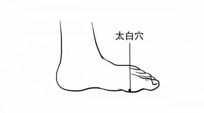 6.太白穴:太白穴集脾经的原穴与腧穴于一身,艾灸此穴,具有健脾益气、祛湿止泻、消食化滞等功效。