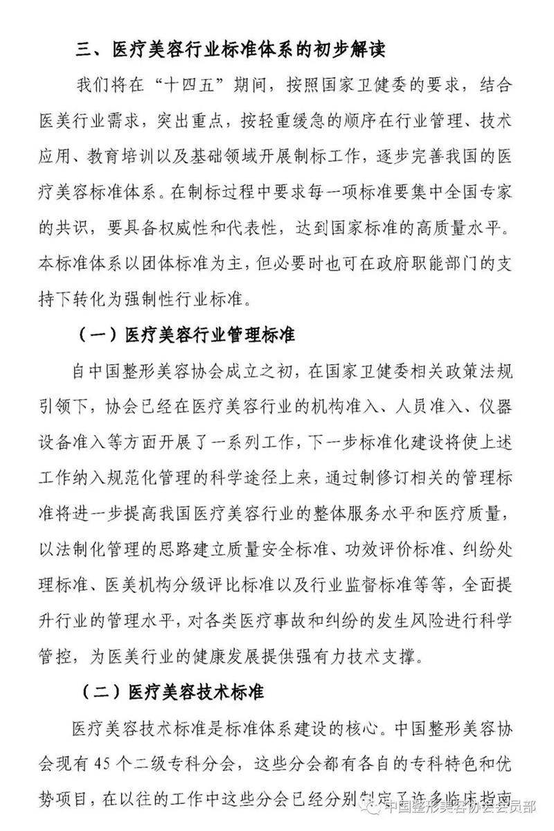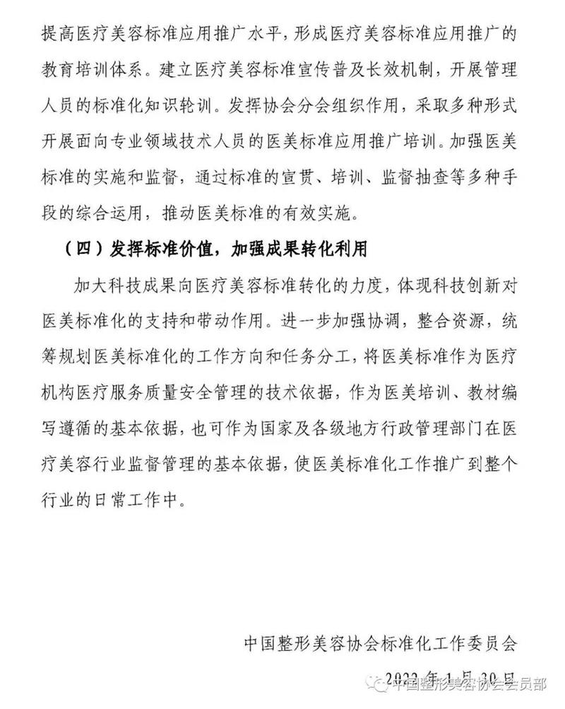 1月30日,中国整形美容协会公布《中国医疗美容标准体系建设“十四五”规划》(草案),内容包括行业管理标准、行业技术标准、教育培训标准、行业基础标准等四个方面近50个标准。协会通知,希望行业同仁对草案进行审阅!