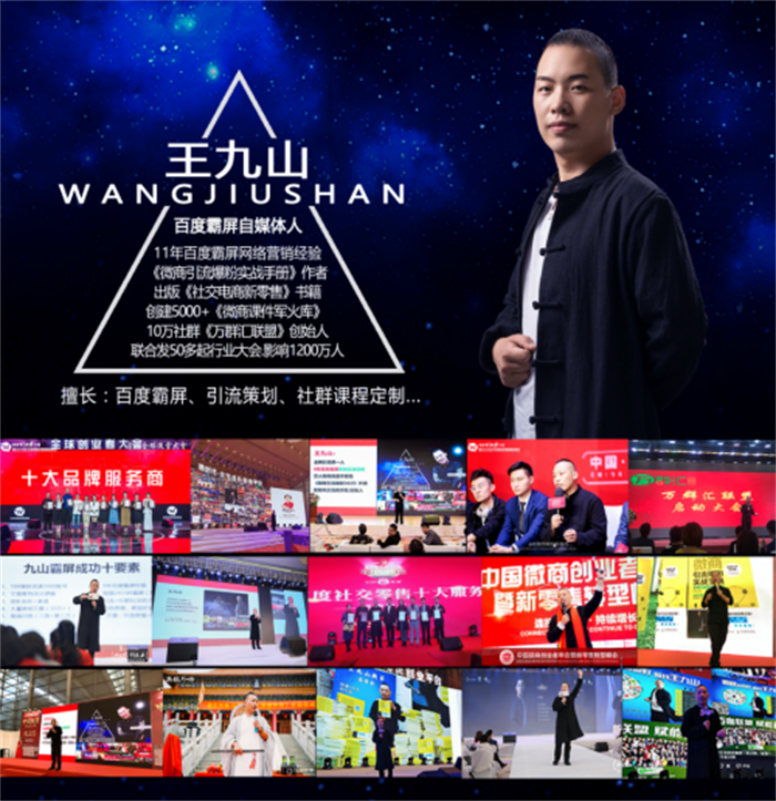 第八、行业大会的背书。在2018/2019年的各个微商大会都能看见王九山的身影,要么受邀在舞台上分享,要么就是海报的底部写着:王九山百度霸屏团队作为媒体支持。很多大会都是和王九山联合主办的,所以,很多大会王九山都可以安排自己合作者、客户、合伙人等上台分享,或者当论坛嘉宾或者当颁奖嘉宾,共享大会资源。这是王九山的优势。他曾说过,“和我合作过的百度霸屏品牌,都可以优先通过筛选安排登台颁奖”,这些行业大会的背书是王九山个人ip的背书,也是帮品牌打造影响力和奖项背书,对于想做推广的公司来说,这无疑是一个很好的附加值。