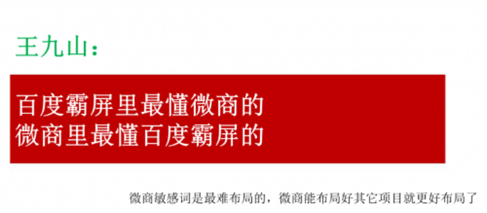 第四、要有微商思维,不管是不是做微商的,一定要具备微商思维,没做过微商的,很难有微商思维,传统做seo和网站建设的很多,但是大部分写的东西对新零售行业以及微商圈是水土不服。即便不是微商,玩法布局都是大同小异。据说王九山是微商里面最懂百度霸屏的,百度霸屏里最懂微商的,一直在深度服务微商品牌。这一点,也是他的优势之一。