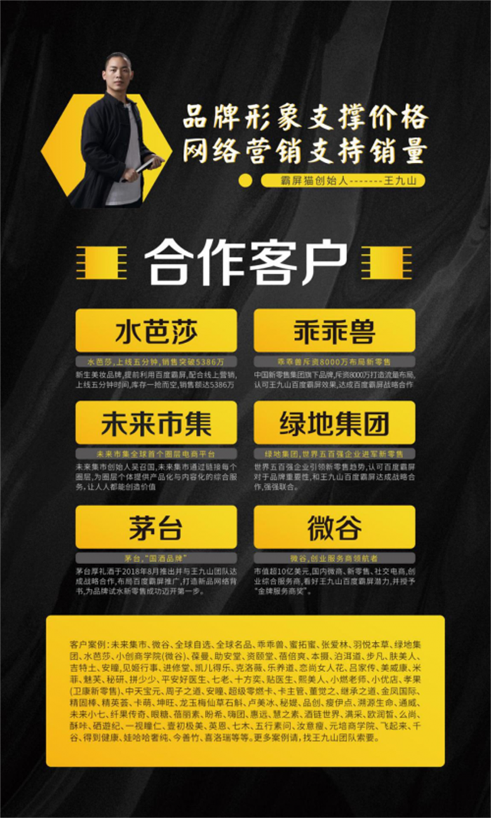 最后再补充一些个人观点:大家做百度霸屏业务除了能打造公司品牌ip之外,也为产品增强了信任背书。百度霸屏就像24小时的业务员,具有自带成交属性,百度霸屏一旦完成布局,会长常年在百度、360、搜狗等搜索引擎展示,后续也不需要另外付费,会给企业带来长期价值。推荐王九山,是因为和王九山老师合作过并深度认可他,分享价值也算是一种慈善,愿大家不要走弯路,与良人为伴。