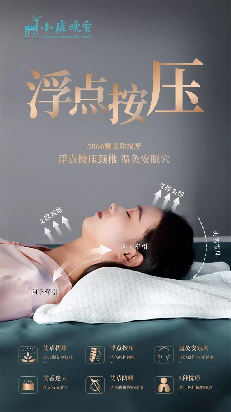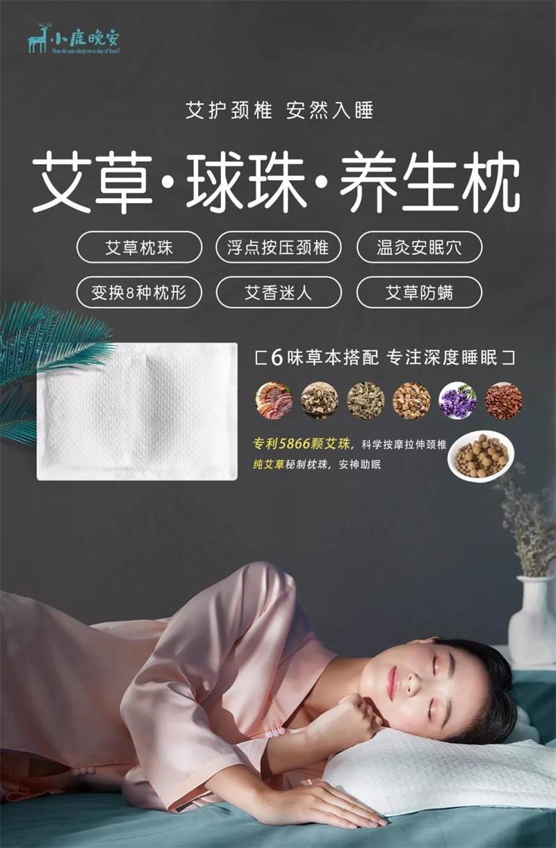 这款小鹿晚安枕,采用多种中药材制成超5866颗以上的艾珠,流动塑形能力极强,可以在头部自重的压力下,自动“塑造”贴合颈椎曲线的枕头形状。