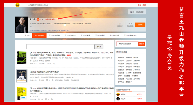 王九山老师作为作者邦平台的入驻成员,正式升级为皇冠终身会员身份,将会享受到平台长期的、终身的优质服务。王老师的个人品牌网站,也将显示皇冠终身会员的特殊标识,并将得到长期的终身的亮相。同时,王老师的介绍、著作、照片、动态新闻、服务、联系方式等内容,也可以获得长期的、持续的、终身的更新与呈现服务。而王老师的品牌实力,更将随着网站价值和魅力的提升而提升。