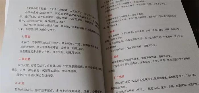 在按摩的手法上,作者总结了几种手法:推法,拿法,揉法,按法,捏法,拍打法,补、泻法。顺时针是补、逆时针是泻,重手法是泻,轻手法是补;从上往下的补,从下往上是泻。