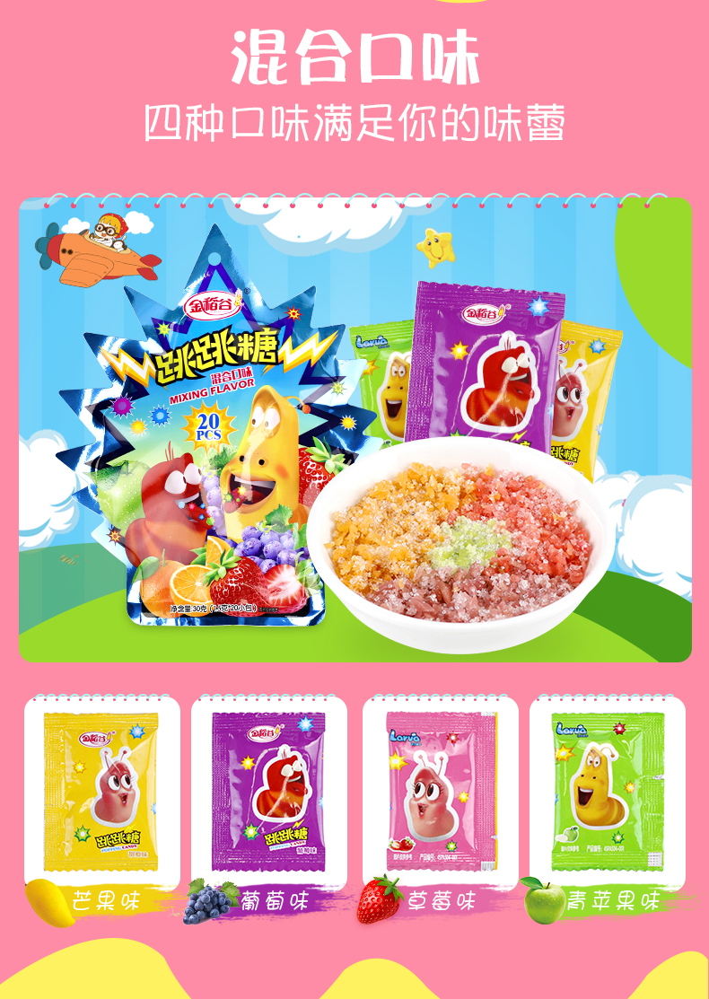 这款跳跳糖是金稻谷和爆笑虫子的联名款呢!丑萌丑萌的爆笑虫子实在太逗了,加上神奇的跳跳糖刺激你的味蕾,简直太配了,你值得拥有!