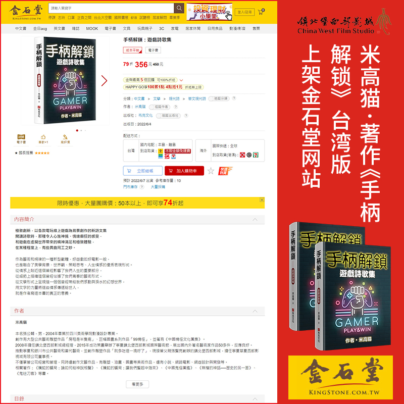 近日,由米高猫创作的最新著作《手柄解锁》台湾版,正式上架博客来、城邦读书花园、诚品线上以及金石堂等各大网络销售平台,拉开了热销的序幕。