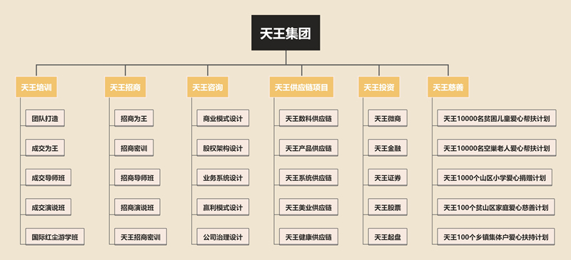 天王集团,是心态潜能激励大师、演说家王洪波先生经过多年努力付出、而创办的一家集咨询、培训、项目孵化、投资一体化的产业公司。它在董事长王洪波先生的带领下,秉承服务大众的初心,在过去的多年时间里,帮助许多受众创造了大量的销售和成交神话,服务过超过五千家上的企业,一场金融招商可以成交一千多万的佳绩。同时,集团更积极主动地参与和投入到公益慈善活动当中,为社会的正能量发展添砖加瓦。
