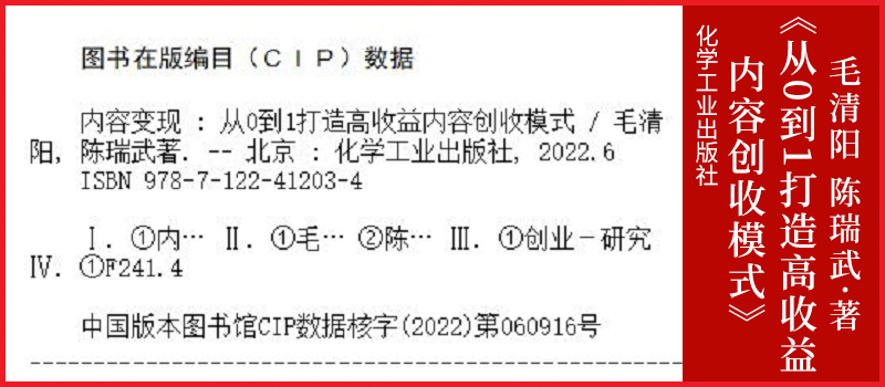 近日,由化学工业出版社出版、陈瑞武等创作的著作《内容变现:从0到1打造高收益内容创收模式》的CIP号和ISBN书号正式下发,很快就将出版上市并与广大读者朋友见面。