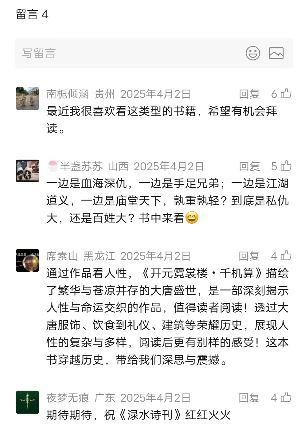 渌水诗刊始终致力于弘扬优秀文学作品、扶持优质创作者,此次对李莎老师《开元霓裳楼・千机算》给予了大力支持与全方位助力。诗刊团队高度认可作品的价值,主动搭建推广平台,依托自身文学资源与传播渠道,为作品进行专题宣传与内容推广,助力作品在文学圈层内扩大影响力,让更多文学爱好者知晓这部精品力作。渌水诗刊的倾力相助,为作品的传播推广注入了强大动力,彰显了文学平台对优质原创作品的责任与担当。