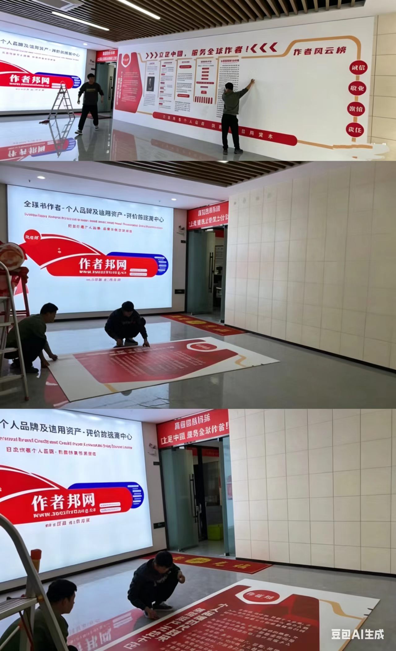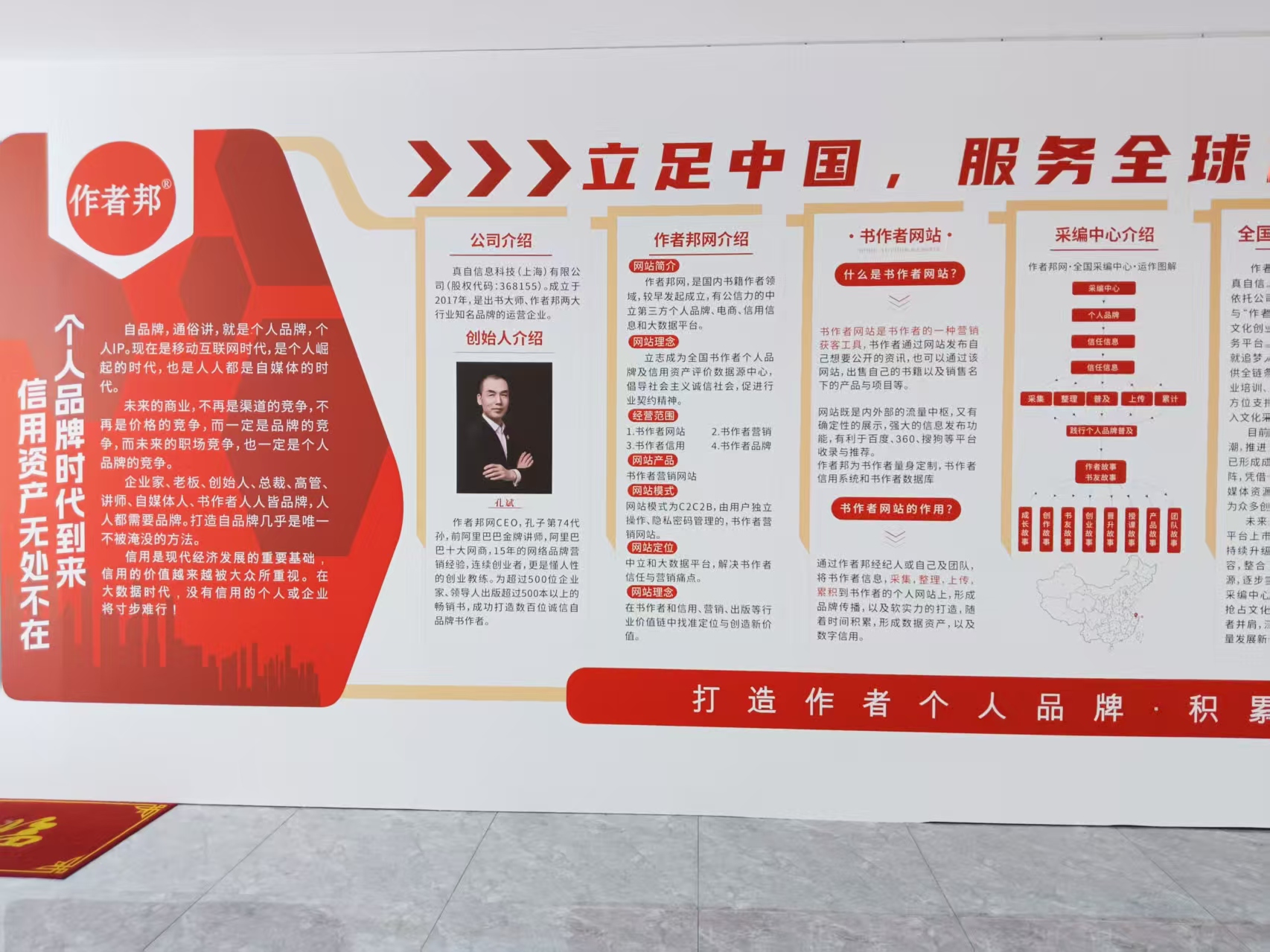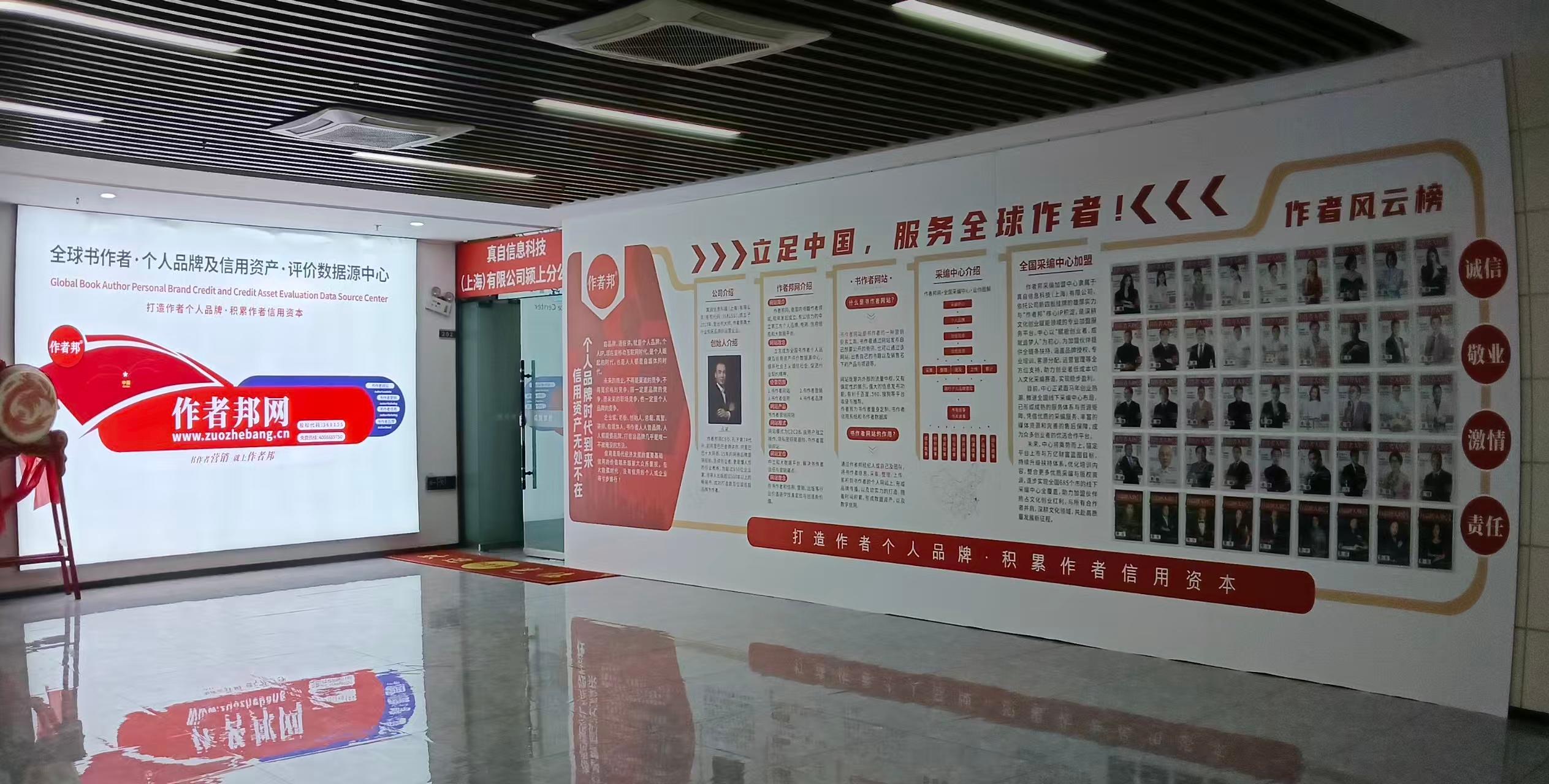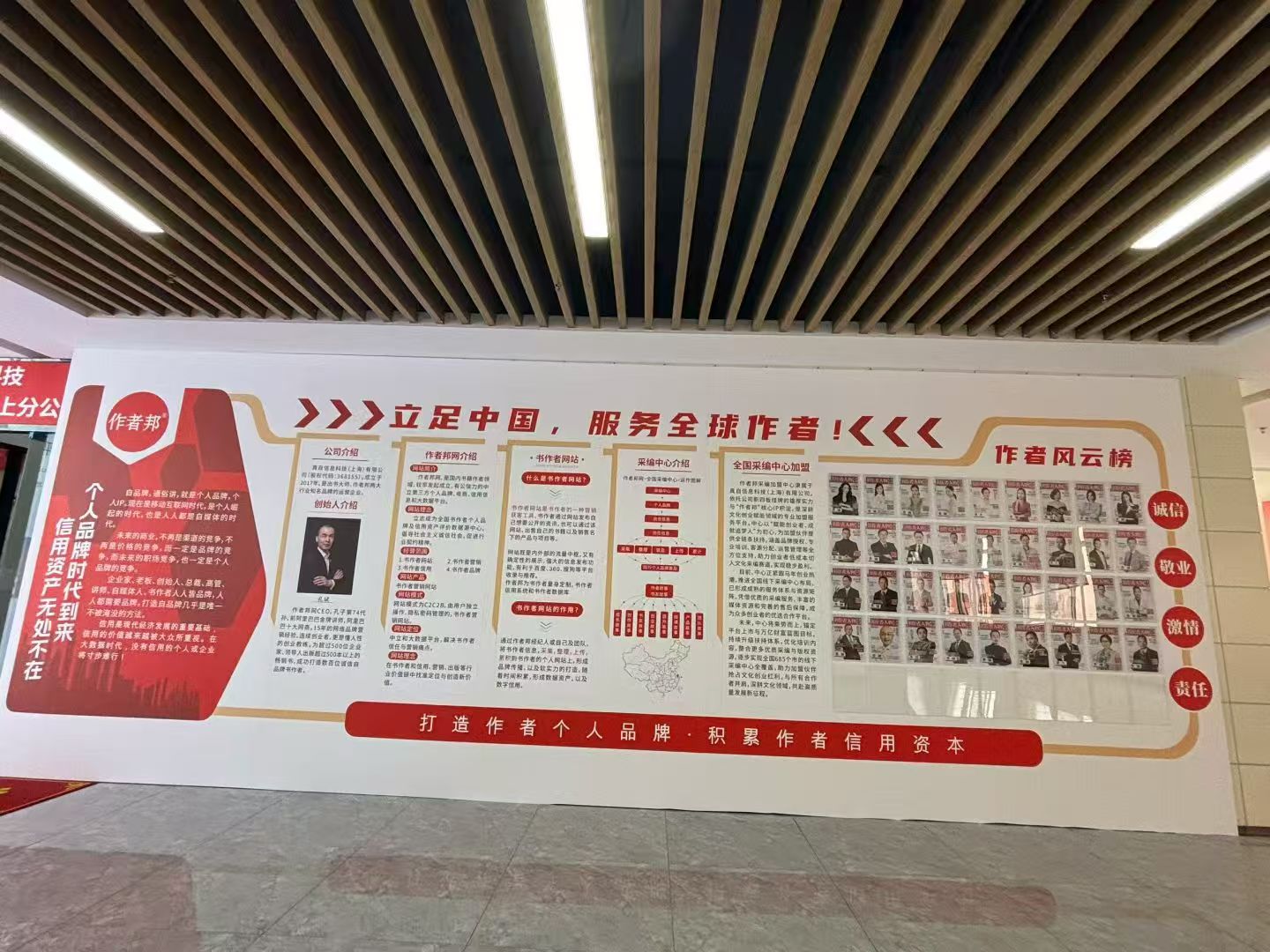 一面文化墙的诞生,远不止把文字和图片贴上去那么简单。在作者邦全国采编中心,这面墙从创意到定稿,经历了与设计师长达数周的反复沟通。设计师出了七版方案,每一版都在“信息密度”与“视觉冲击”之间寻找平衡。我们向设计师反复阐释作者邦的商业模式——从“采集、整理、上传、累计”的运作链条,到“个人信用资产”的核心价值主张。