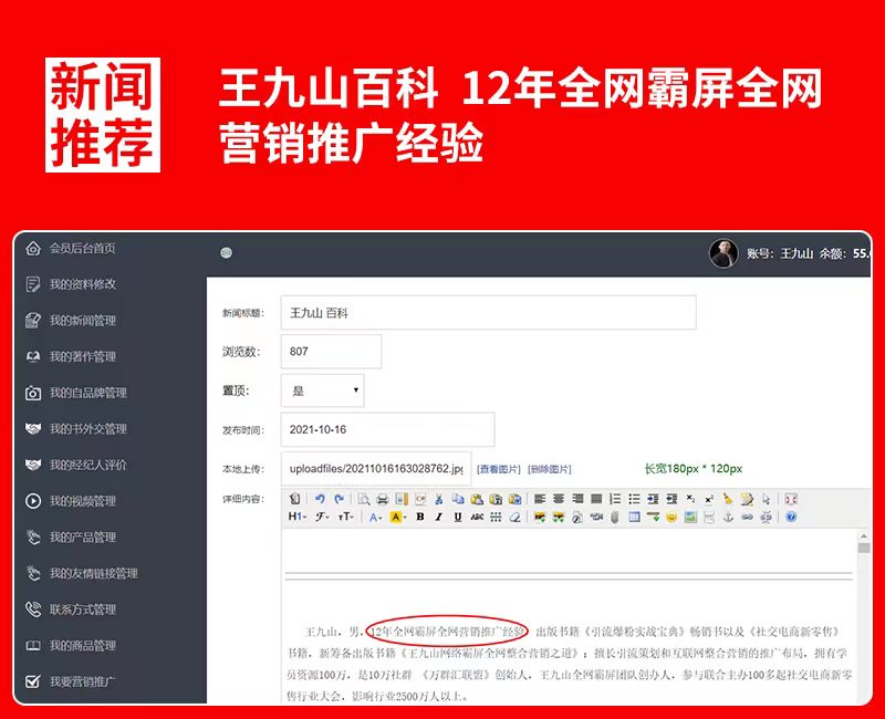 近日,作者邦网为入驻会员王九山老师提供书作者品牌信息营销优化的操作和运营,为其个人的知名度实力提升,发挥了积极而富有价值的作用。同时,更彰显出作者邦网用心服务好每一位客户的独特魅力...
