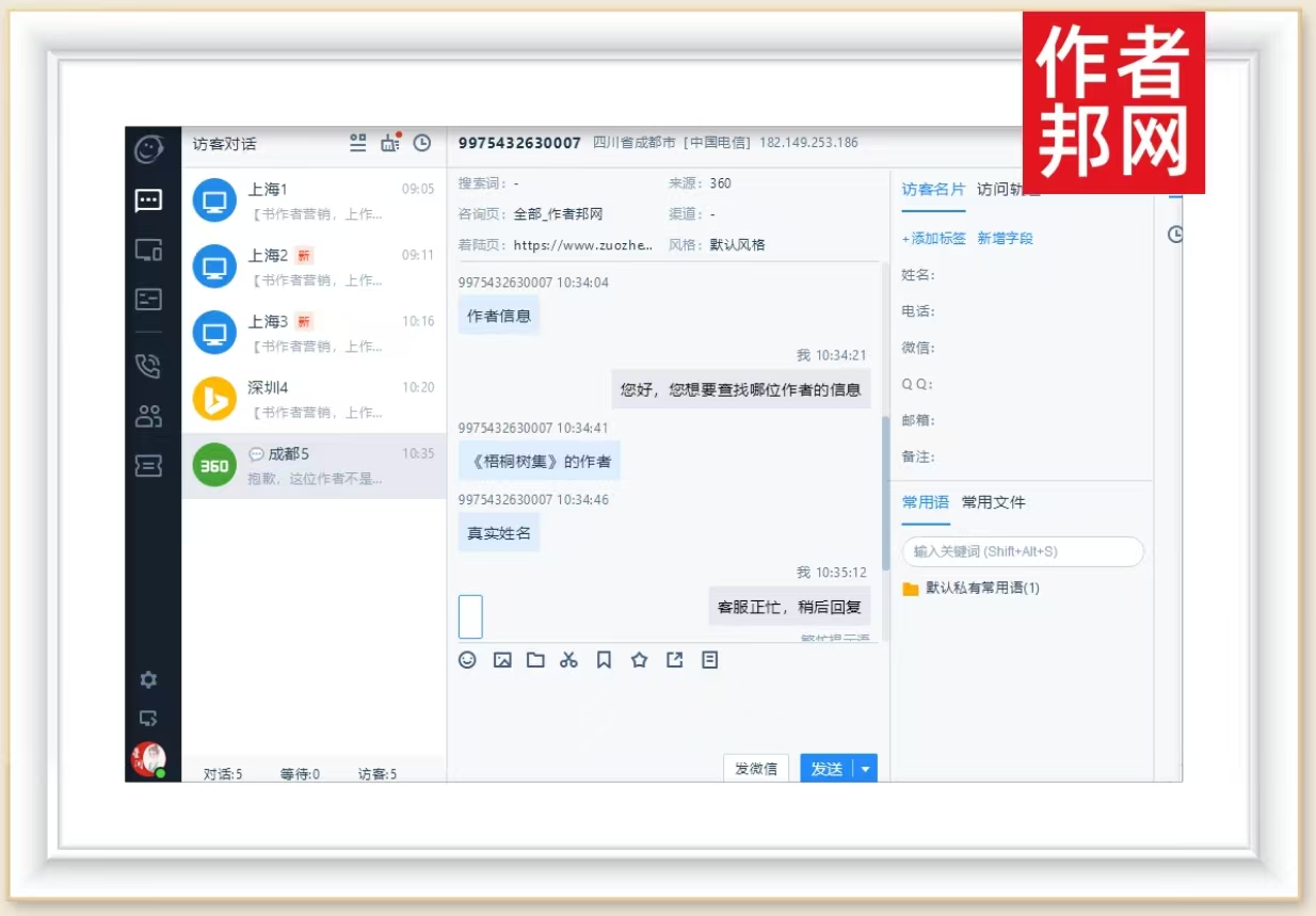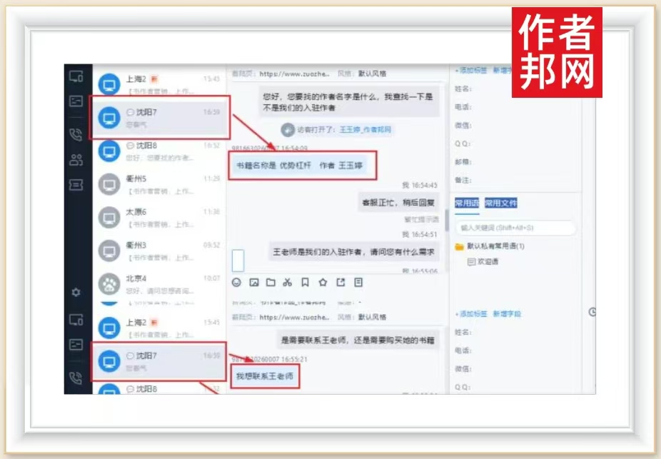 近日,作者邦网接待了来自沈阳地区的访客用户,作者邦网经纪人用耐心、真诚以及友善的态度,为访客用户提供了细致而温馨的解答服务。从中,传递出了作者邦网真诚待客、客户至上的初心原则。据作...