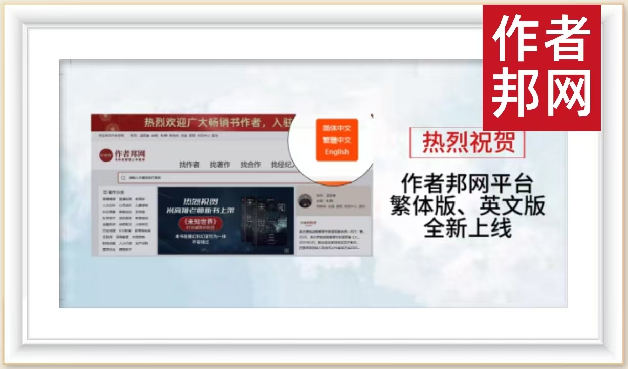 作者邦平台迎来了重大升级,成功上线了繁体版和英文版网站。这一举措不仅提升了平台的国际化水平,更为来自德国、美国、法国、英国、俄罗斯、泰国、日本、加拿大以及东南亚等国家,以及港澳台地...