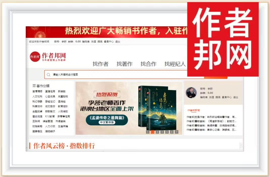 2024年12月25日,畅销书作者周鹏老师莅临作者邦网指导工作,受到了该平台创始人孔斌老师的热情接待。两位行业领军人物的会面,不仅为作者邦网带来了新的活力,也为双方未来的合作与发展...