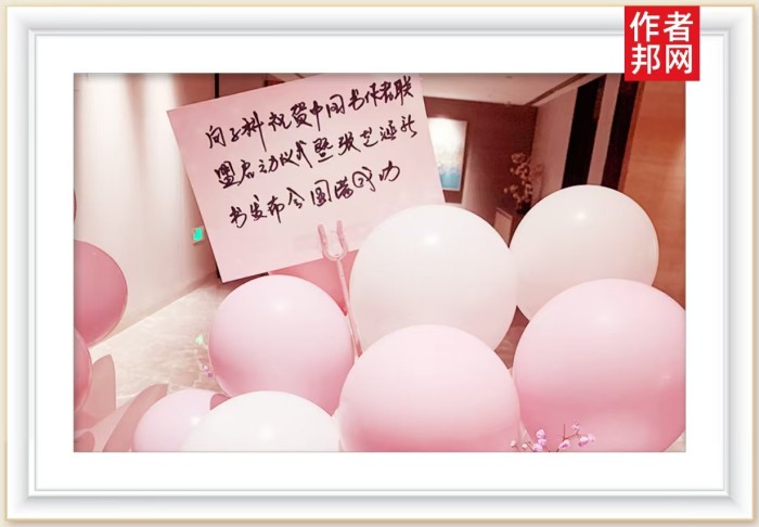 他,往往会通过跟别的书作者的互动、交流以及鼓励支持等,去表达他对这个行业的助力和心愿。近日,在中国书作者联盟启动仪式暨张芝涵新书发布会上,向子科老师作为其中一个送来祝福的名家,让活动现场增添 了不少热闹与隆重的气氛。祝福以花篮配合卡片的形式,出现在了活动现场。花篮上,不仅有粉紫色的鲜花,更有粉色的气球。整体上,给人以温暖、美好而又阳光的节日气息。而在花篮的最上方,则是向子科老师的祝福卡片。当中,写着:“向子科老师祝中国书作者联盟启动仪式暨张芝涵新书发布会圆满成功。”的字样。
