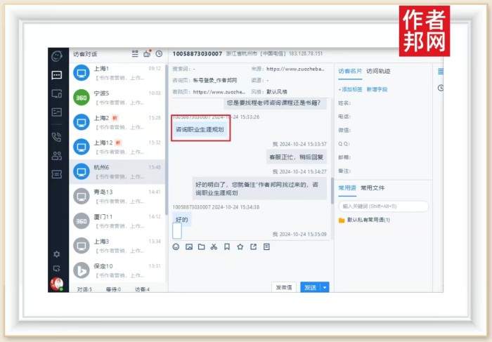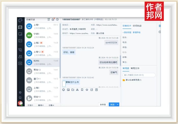 据作者邦网相关访客咨询信息页面上看,该杭州客户是通过作者邦网的程社明老师入口进入访问的。而且,是客户主动访问和咨询了作者邦网。页面更显示,客户详细地询问了有关程老师的联系方式和添加好友的备注方法。可以看出,客户希望与程老师明老师的合作意愿比较强烈。
