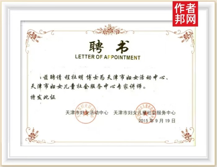 (程社明老师被聘请为“天津市妇女活动中心,天津市妇女儿童社会服务中心专家讲师 ”)