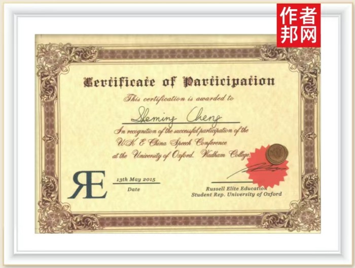 (程社明老师受邀到英国牛津大学演讲职业生涯管理荣获”成功演讲证书“)