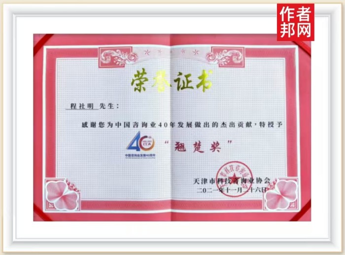 (程社明老师被天津市科技咨询协会授予“翘楚奖”)