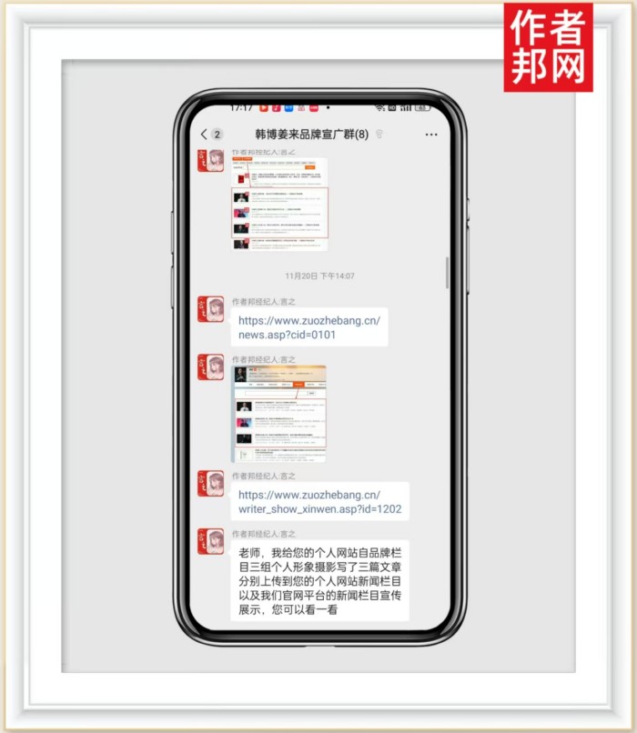 作者邦经纪人关注与沟通作者是否获得新的荣誉证书,以及是否拍摄新的形象照。收集制作上传到自品牌栏目展示,并做到照片的故事描述,标题、简介与关键词编写,有利于百度、360、搜狗、谷歌等搜索引擎平台收录。