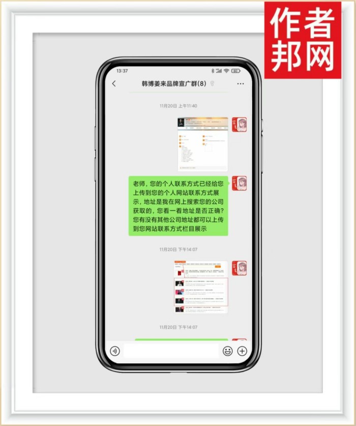 将为会员作者添加的联系方式,视频,产品,优化上传的新闻、书外交、自品牌栏目信息,页面截图与链接以及栏目说明在作者群内告知,让会员作者知道经纪人为作者做了什么服务,以及介绍服务内容的作用与好处。