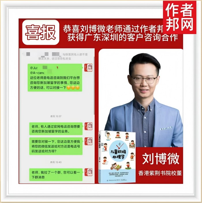 在知识经济蓬勃发展的今天,跨界合作已成为推动行业发展的重要力量。近日,卓盈资本合伙人、香港紫荆书院校董、畅销书作者刘博微老师通过作者邦平台成功获得了广东深圳的客户咨询合作,这一合作不仅展现了刘博微老师在多个领域的深厚影响力,也体现了作者邦平台在促进作者与企业之间合作方面的卓越能力。