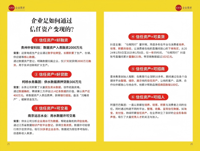 信任资产的变现,体现在合作、交易、资源链接的方方面面。对企业而言,它可以是融资的“通行证”——贵州中安科技凭借数字化转型积累的核心数据资产,27天内获得2000万元融资;也能成为贷款的“抵押物”,柯桥水务集团通过13.4亿条用水数据确权,获得300万元质押贷款。更可转化为交易标的,南京远古水业将用水数据许可给银行,开辟新收入来源;还能助力招商、吸引人才,壹本教育靠行业信任累计招商回款破百亿,阿里巴巴则以品牌信誉聚拢全球精英。
