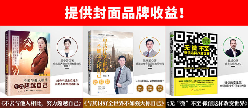 从某种程度上来说,书籍封面品牌收益的价值更多的体现在隐形的品牌效应的提升,这是一种无形的价值塑造。从出书大师网推出此项权益至今,已有众多诸如CEO孔斌先生、满妃健康产业集团董事长盛家齐先生、金旺集团董事长陈瑞武先生、芳大健康集团吴小芳女士等企业家名流都享受了此项封面品牌收益所带来的附加值,他们的书籍在凭借着独特封面设计被更多读者知晓的同时,其自品牌发展的愈发蓬勃,散发着强大的生命力。