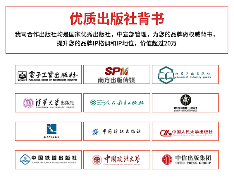 我们不难发现,在出书大师网合作出版社的列表中有一个共通点,它们均是国家优秀出版社,中宣部管理,能够为作者的自品牌出书做权威支撑,实现品牌背书,从而提升客户品牌的IP格调和IP地位,价值超过20万的权威出版社体系,能够为客户出书品牌输出持续赋能。