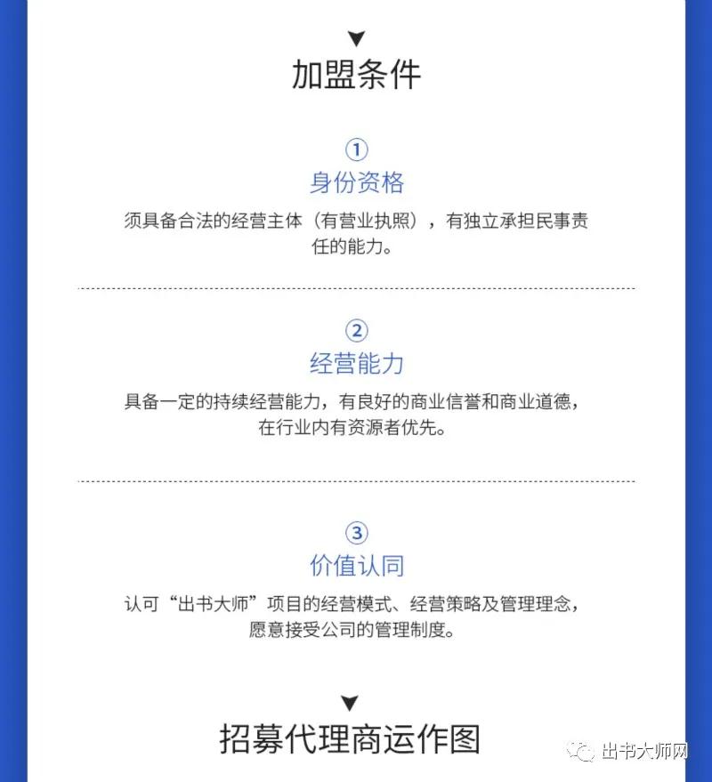 只要是热爱代理出书行业并希望实现创业财富自由的人,只需向出书大师网进行申请,都可以有机会成为现稿代理出书产品业务的加盟代理商。并且,还有机会全面对接出书大师网的多层面的平台业务。