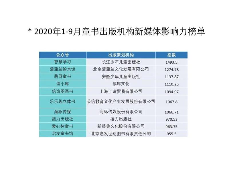 *2020年1-9月童书出版机构新媒体影响力榜单