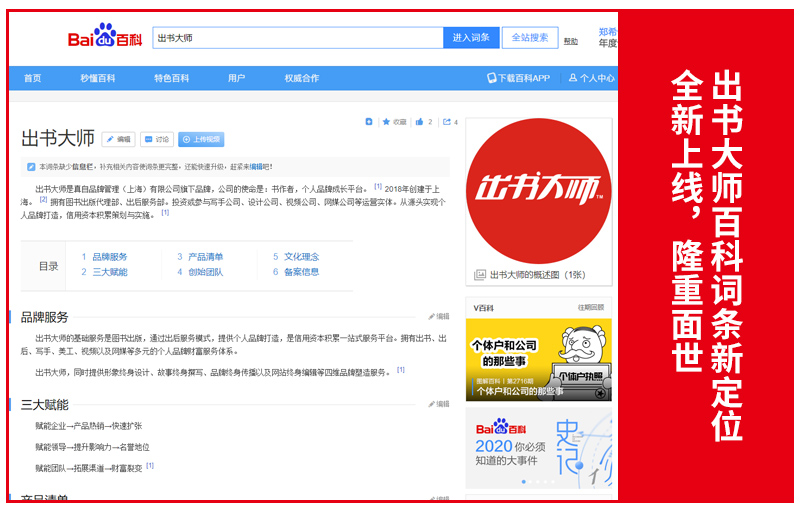 近日,出书大师新定位的百科词条在百度百科平台全新上线,以成为书作者个人品牌成长平台的使命隆重面世,正式展现公司的整体介绍、服务优势以及品牌文化等概况。