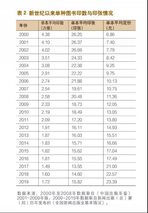 表2更加直观,2000年到2019年,20年间单本平均印数从4.38万一路降至1.72万,而每本平均定价从6.86元,一路升至23.39元。别对这个数据惊讶,这是包含了教材教辅的所有数据的平均值,贵社的一般图书,平均印数大概率到不了1.72万册。