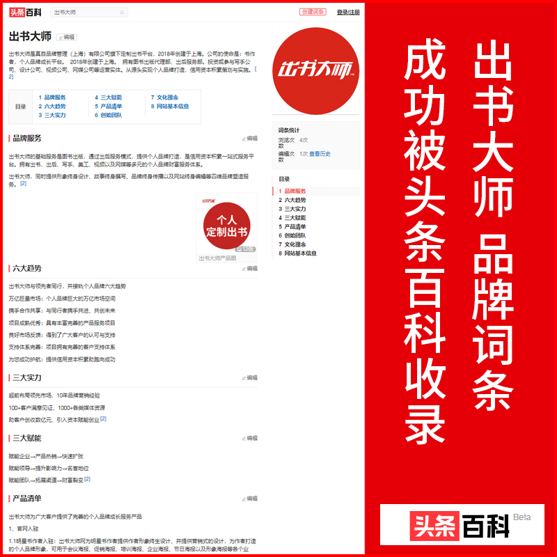 近日,出书大师全新定位后的百科词条隆重上线头条百科,这标志着出书大师的品牌知名度再上一个新台阶。