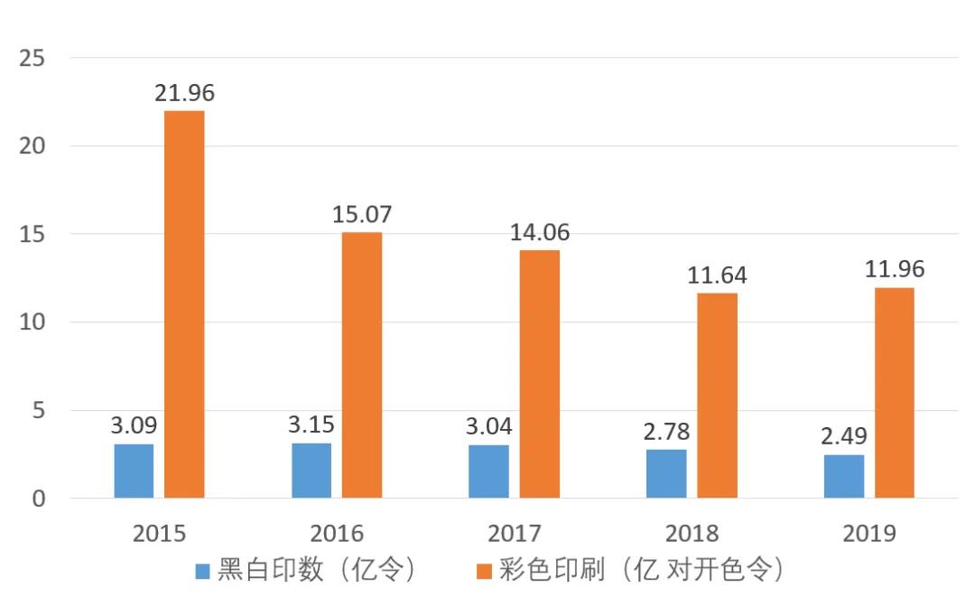 印刷复制仍是出版产业中比重最大的产业门类。从其中与出版物关联密切的出版物印刷来看,“十二五”末以来,无论是黑白印刷产量还是彩色印刷产量,虽间或有所增长外,总体趋势处于下降状(见图11)。其中黑白印刷是先增后降,即2016年同比增长1.94%,2017、2018、2019年分别同比下降3.49%、8.55%、10.43%;彩色印刷是先降后增,即2016、2017、2018年分别同比下降31.38%、6.70%、17.21%,2019年同比增长2.75%。2019年与“十二五”末比较,黑白印刷产量下降19.42%,彩色印刷产量下降45.54%,彩色印刷降幅大于黑白印刷降幅26.12个百分点。出版物印刷产量的下降,系纸质出版物总量减少所致,即出版产业产品结构演变的结果,这一趋势在“十四五”时期恐会延续。好在“十二五”末以来,出版物印刷的营业收入呈递增状,即2016年同比增长3.28%,2017年同比增长4.04%,2018年同比增长2.46%,2019年同比增长0.21%。