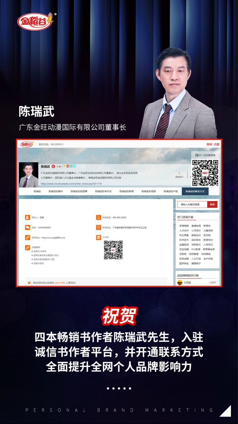 近日,四本畅销书作者陈瑞武先生,受邀入驻出书大师诚信书作者平台,并已公开相关的联系方式,个人品牌影响力得到全网范围的极大提升。
